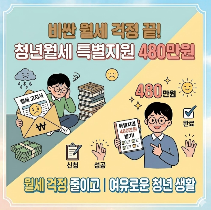 여러분의 비싼 월세 고민을 시원하게 해결해 줄 청년월세 특별지원을 잊지 말고 신청하셔서, 최대 480만원의 혜택을 꼭 누려보시길 응원합니다.
